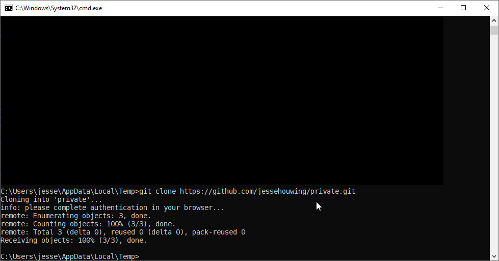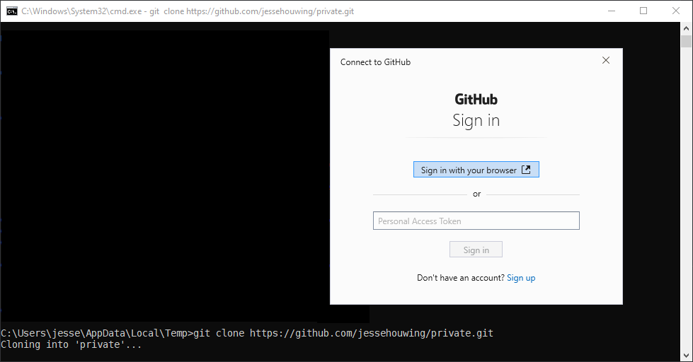 当提示登录/验证时,用令牌替换密码。注意: PAT不适用于UI,但它是从cmd提示符开始工作的