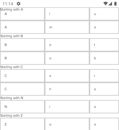 您不能使用Compose的LazyGrid apis真正创建一个粘性的标题,但是您可以创建一个标题,如下所示: