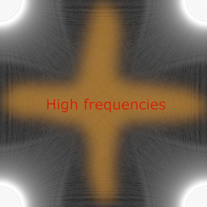 请注意,高频率将不完全在中心,而是在交叉形状的位置。下面的图像显示了一幅图像的无移位FFT计算。橙色部分是最高的频率,而最低的是在角落。