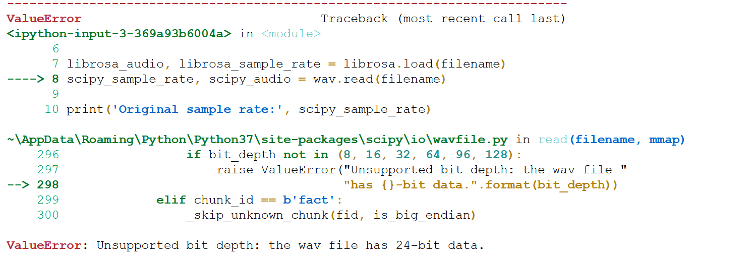 我有一个24位深度的音频文件。当我尝试使用wavfile读取文件时,会得到以下错误: