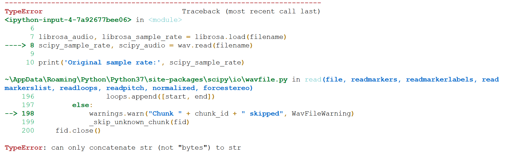 然后,我继续用更新后的增强型wavfile.py取代原来的wavfile.py在这里发现,据说它可以读取24位文件。但是,我得到了以下错误: