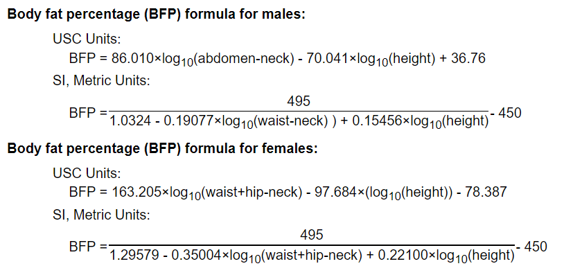 BF% = 495/1.0324 - 0.19077×log10(navel-neck) ) + 0.15456×log10(height)-450