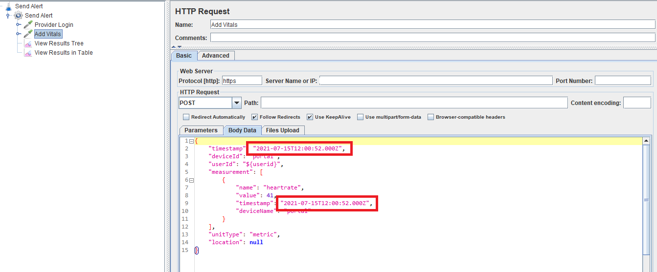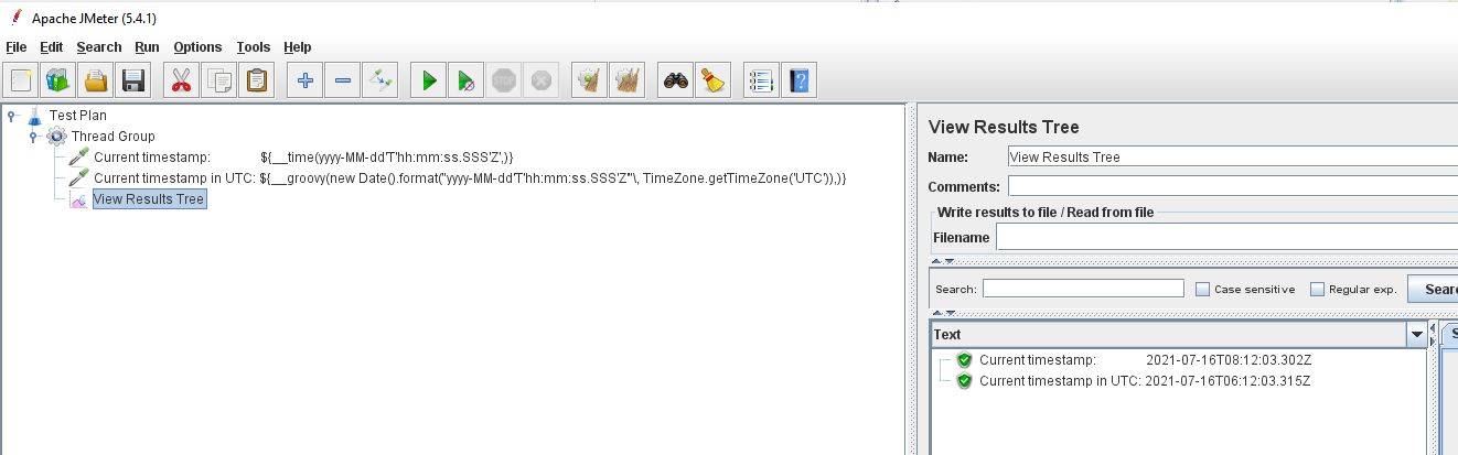 我有一个API测试计划,它运行在JMeter上,里面有时间戳参数,需要当前的时间戳,UTC,YYYY DDTHH:mm:sss.ss格式。例如时间戳:"2021-07-15T12:00:51.308Z“