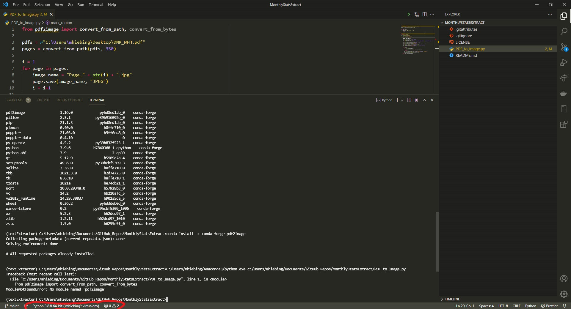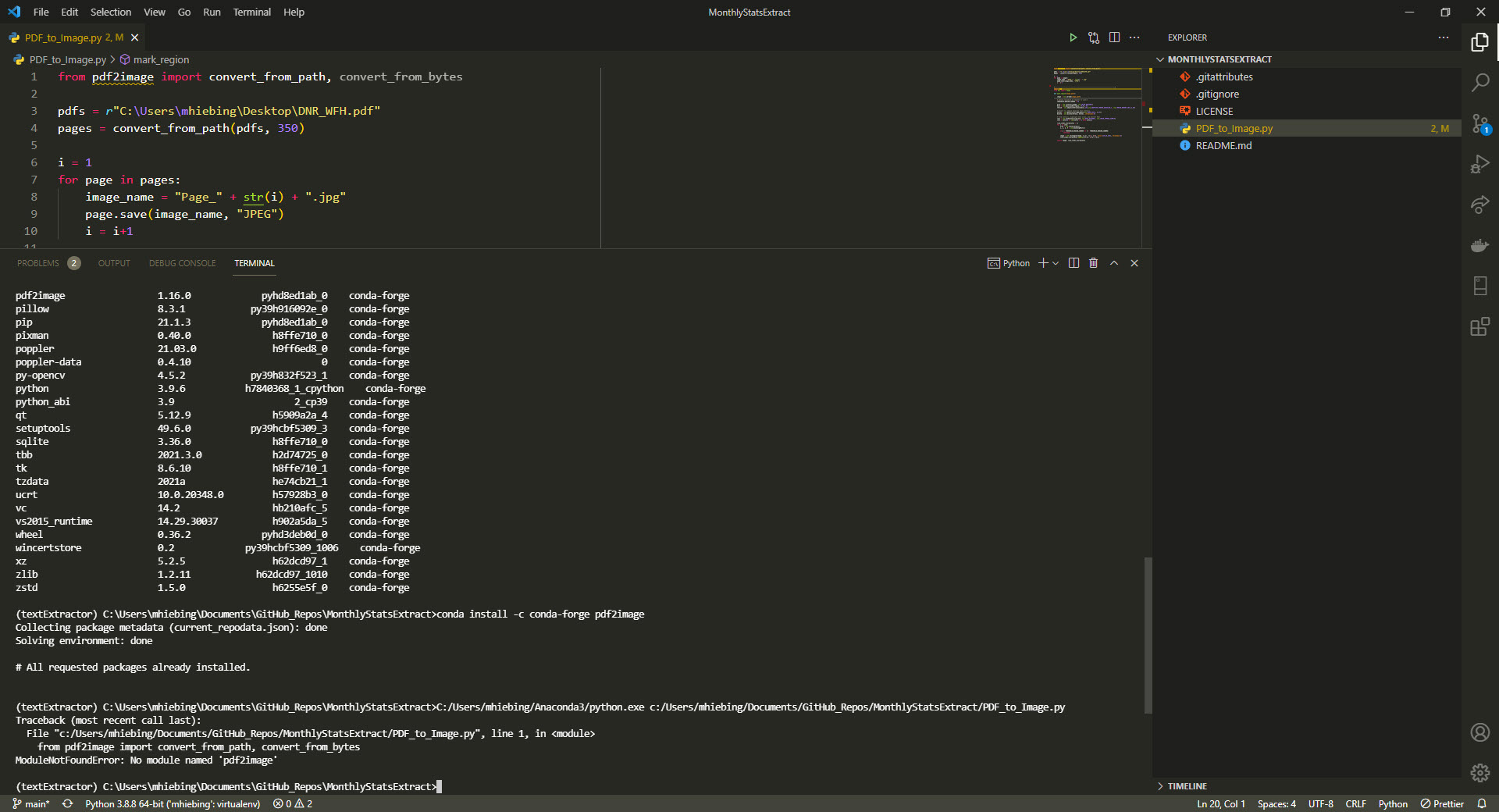(textExtractor) textExtractor 回溯(最近一次调用):文件"c:/Users/mhiebing/Documents/GitHub_Repos/MonthlyStatsExtract/PDF_to_Image.py",第1行,从pdf2image导入convert_from_path,convert_from_bytes ModuleNotFoundError:没有名为“pdf2image”的模块