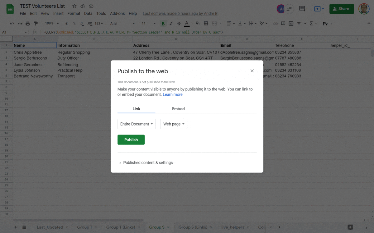 根据我的建议,我对电子表格进行了匿名化和简化。有两个选项卡我想发布到网络:集团T和集团S。