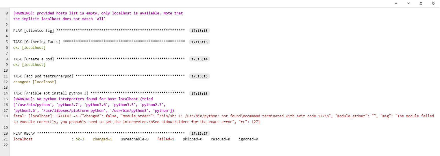 我正在尝试使用Ansible Playbook在运行在AKS上的ubuntu容器中安装python3。下面是我在剧本中所遵循的步骤。