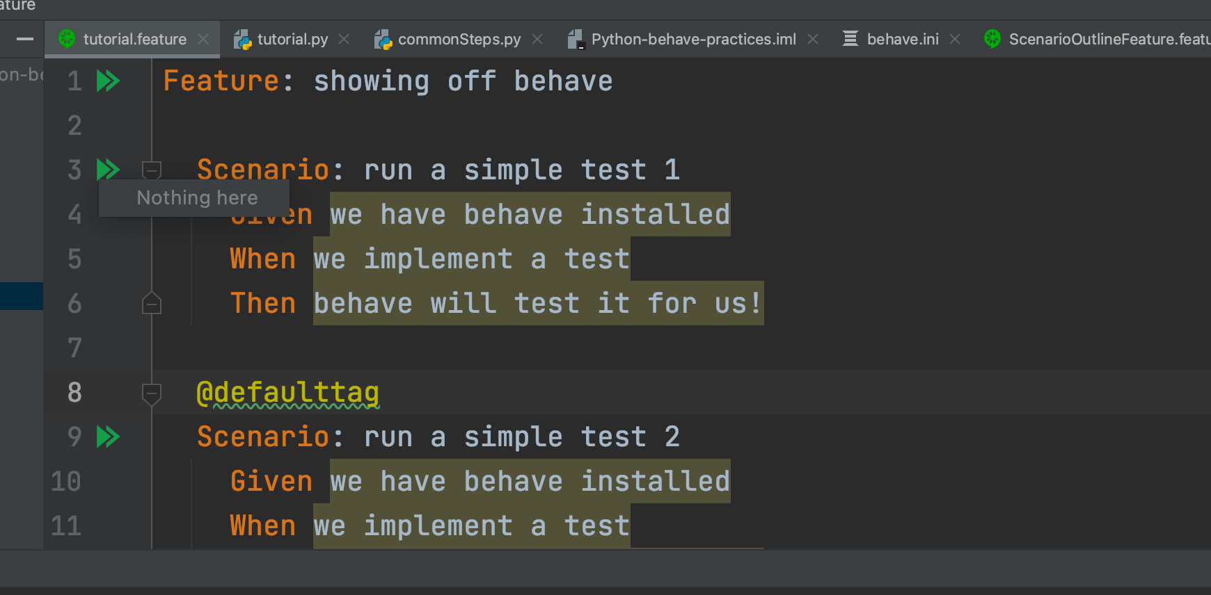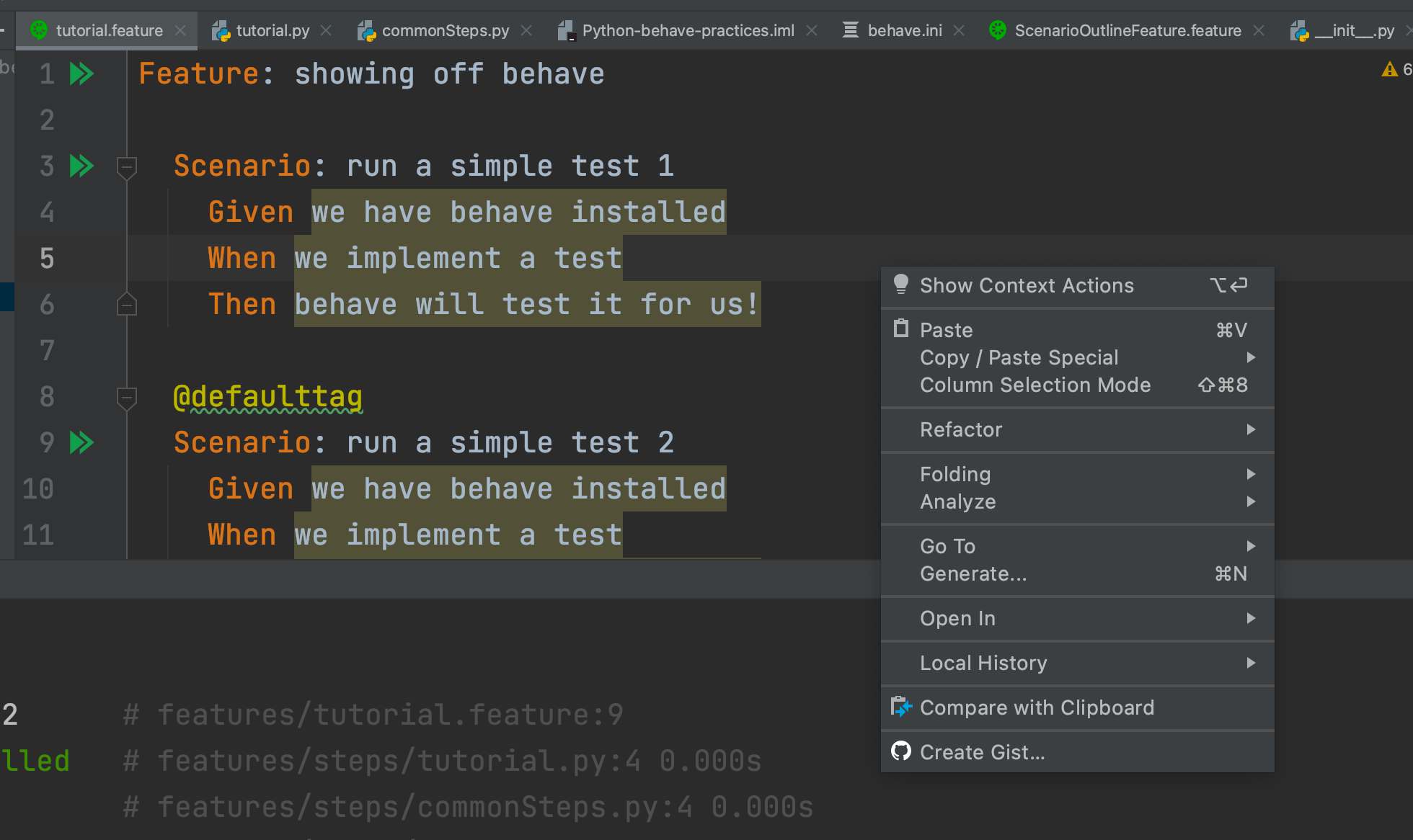 步骤被标识为未实现,而步骤则使用behave CLI工具成功地实现和执行。