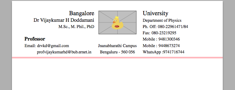 \multicolumn{1}{r}{M.Sc., M. Phil., PhD} && \multicolumn{1}{l}{Ph. Off: 080-22961471/84} \\