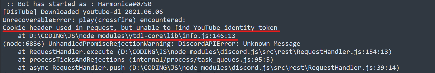 是的,当bot试图获取歌曲并使用cookie时,这是一个ytdl核心错误,但是库找不到“身份令牌”,所以可以使用Javascript try/catch来防止它:
