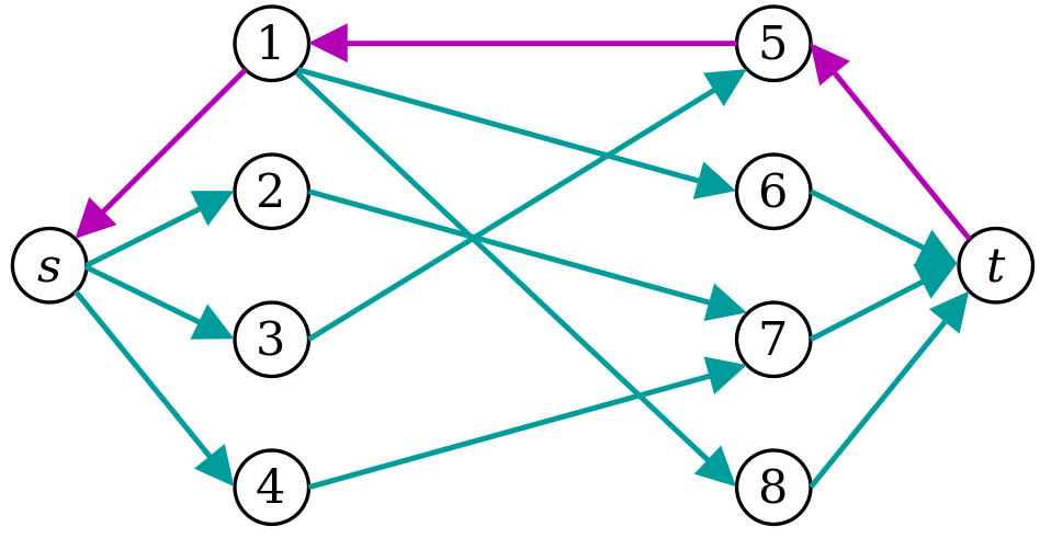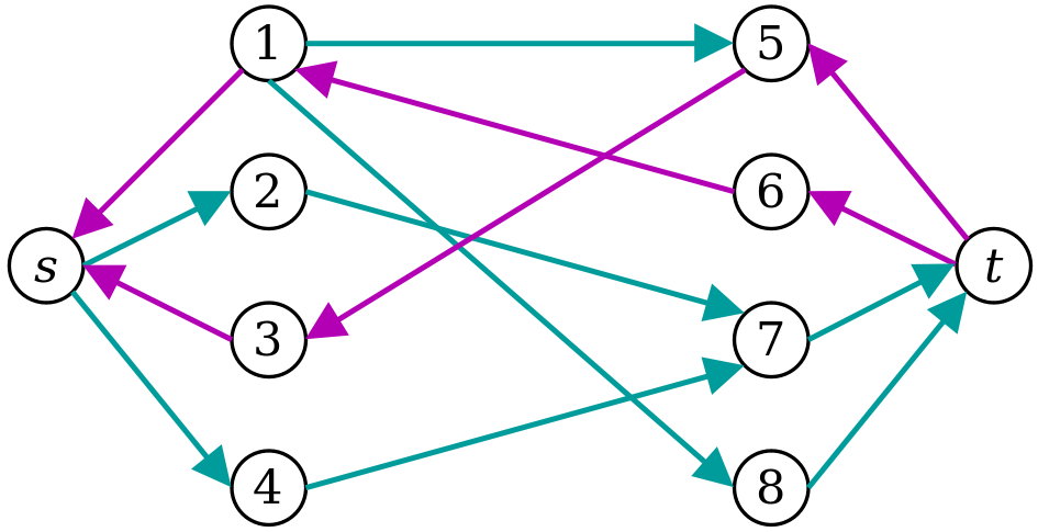 在这里,从s到t的边,紫色的边从t向s的方向流动。