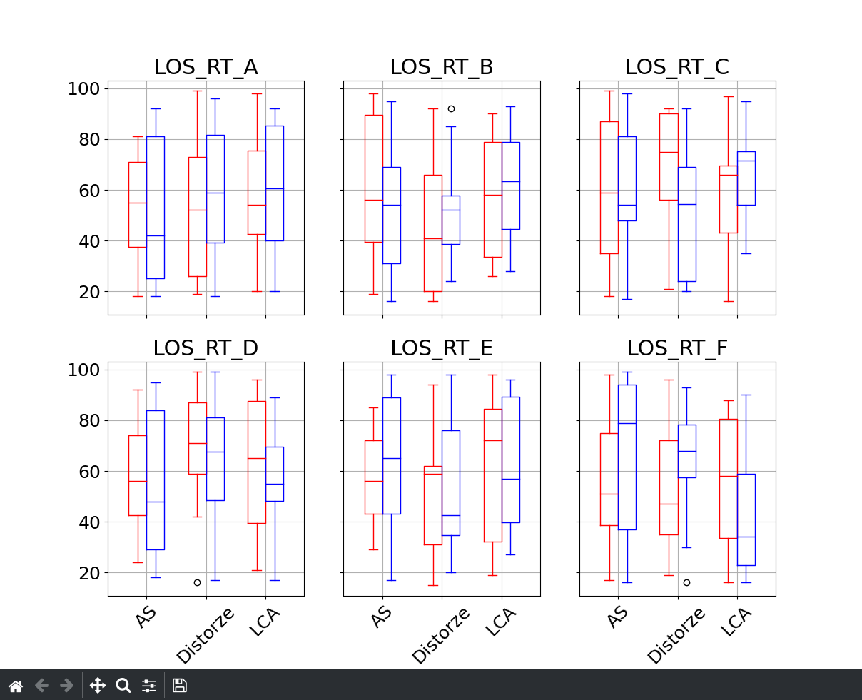 我有超过50个特征的数据集,与腿部康复过程中的特定运动相对应。我比较了使用康复装置的组和不使用康复装置的组。该小组包括有3种诊断的病人,我想比较每一次诊断前(红色盒图)和后(蓝盒图)的盒型图。这是我正在使用的片段和我正在获得的输出。