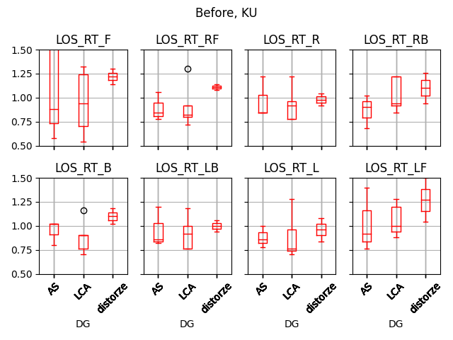 b1 = dataKUBefore.boxplot(column=list(dataKUBefore.filter(regex='LOS_RT')), by="DG", rot = 45, color=dict(boxes='r', whiskers='r', medians='r', caps='r'),layout=(2,4),return_type='axes')