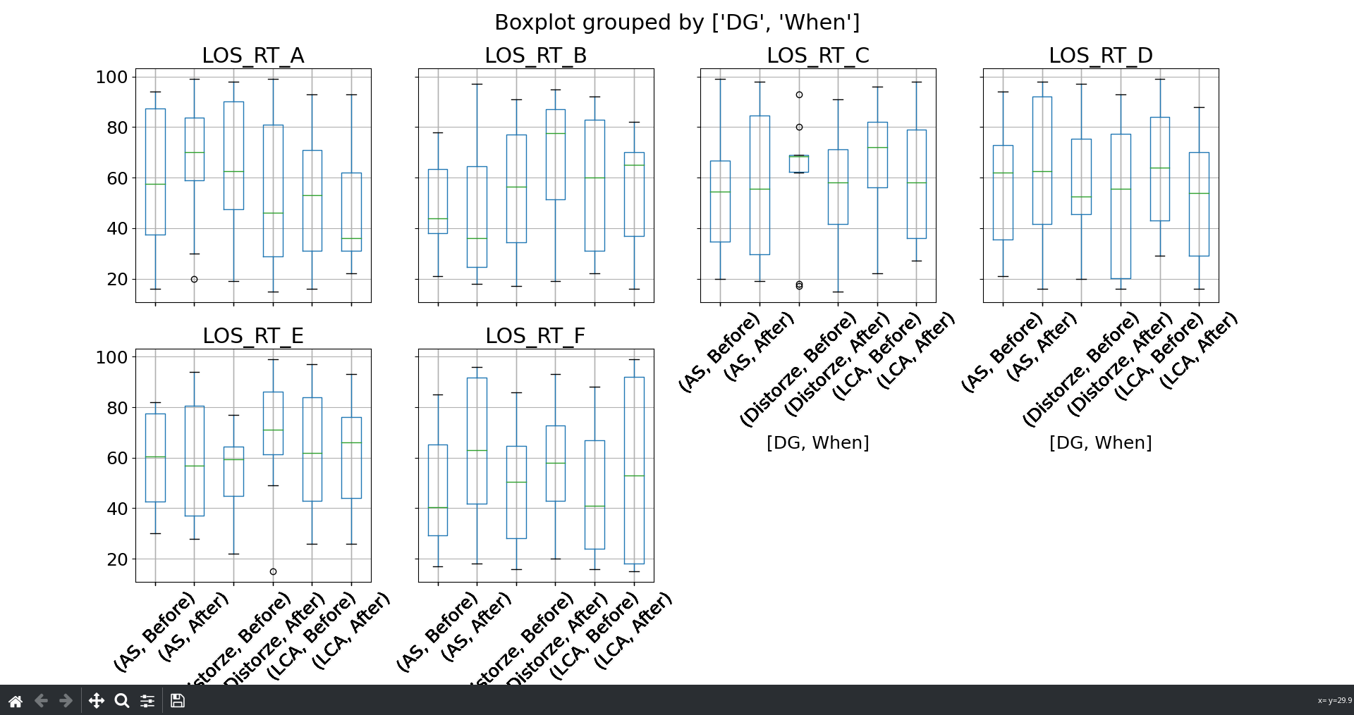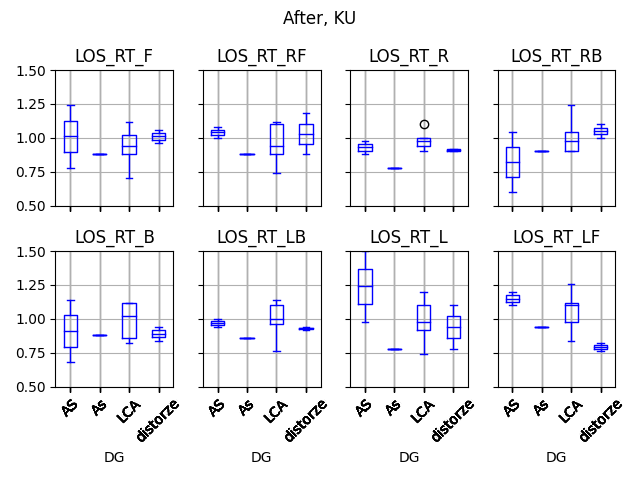 dataKUAfter.boxplot(column=dataKUPlot.filter(regex='LOS_RT').columns.to_list(), by=['DG', 'When'], rot = 45, layout=(2,4), return_type='axes')