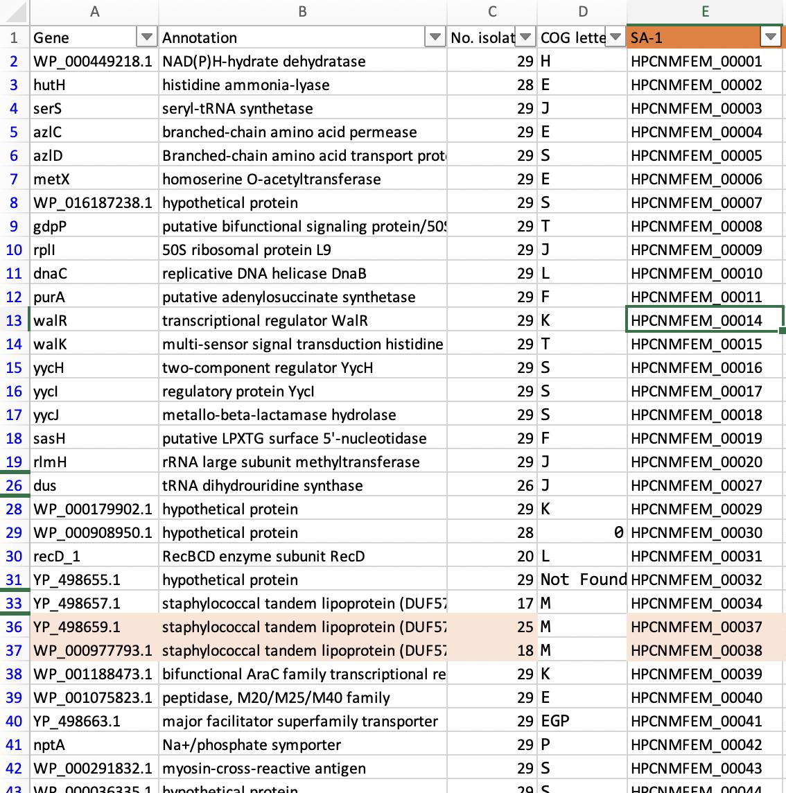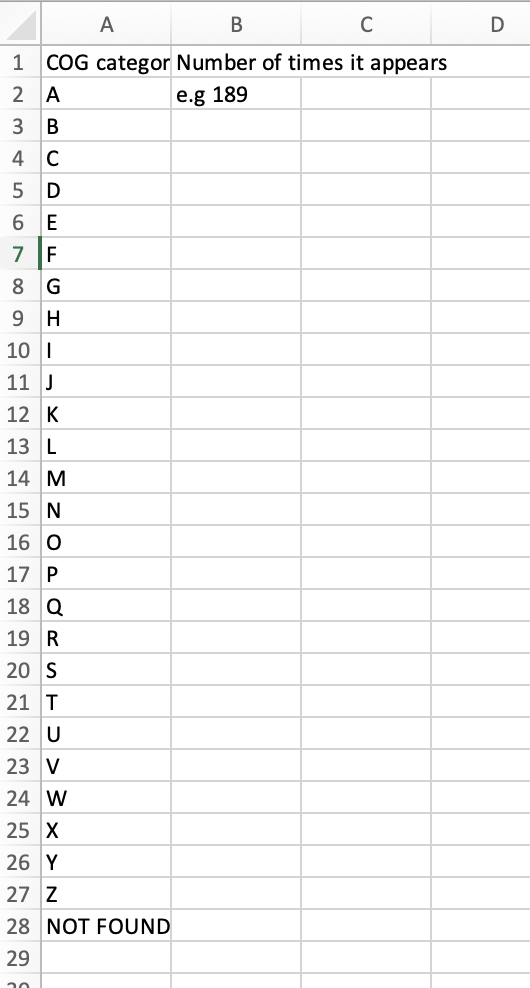 在我的基因组分析的最后一部分,我必须制作一个与基因功能相关的饼图。我有一个excel电子表格,上面有基因功能和相应的字母类别(COG字母栏D在屏幕截图中),为了制作饼形图,我需要按C列过滤,这样我就可以根据我在分析的某些部分看到的基因组数量来调整基因组的数量,然后计算这个字母在大约4000个基因的列表中出现了多少次。在按C列进行过滤之后,我想创建一个表,它看起来像第二个屏幕截图。问题是,有些字母出现不止一次,例如,EGP (第40行-将需要计算为一个E,一个G和一个P分别表中的饼图)。任何建议/公式都非常感谢。