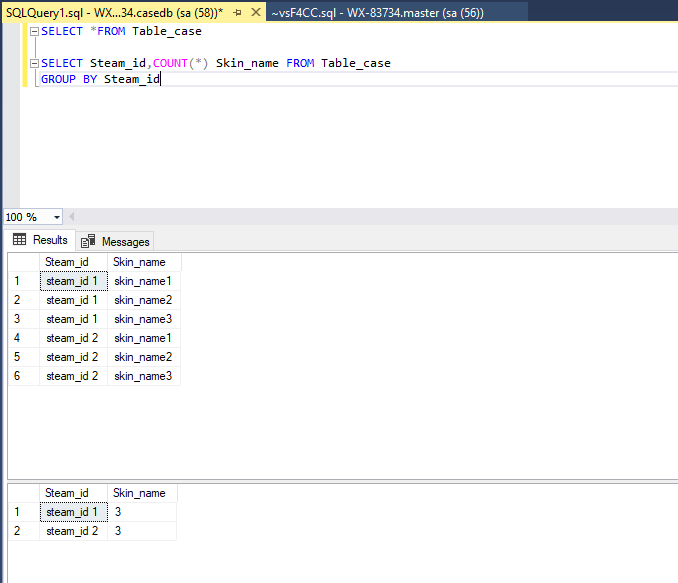 SELECT Steam_id,COUNT(*) Skin_name FROM Table_case GROUP BY Steam_id