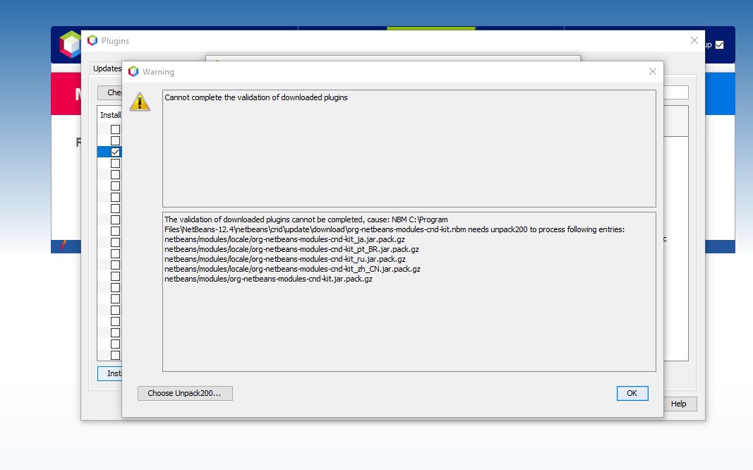 您会遇到这个问题,因为NetBeans正在使用JDK 16下载一个插件,该插件的下载过程依赖于unpack200工具,它在JDK 11中被废弃,在JDK 14中被删除。。