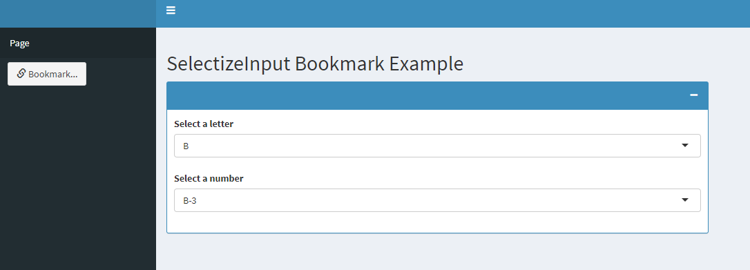 这个效果很好。但是当我添加一个书签按钮时,我不能恢复第二个selectizeInput,只有第一个。例如,如果按下面的方式选择"B“和"B-3”,然后单击"Bookmark“按钮,就会得到一个URL (https://yuchenw.shinyapps.io/selectizeinput_bookmark/?_inputs_&sidebarCollapsed=false&Example=%22Page%22&sidebarItemExpanded=null&_values_&Number_Select=%22B-3%22&Letter_Select=%22B%22)。