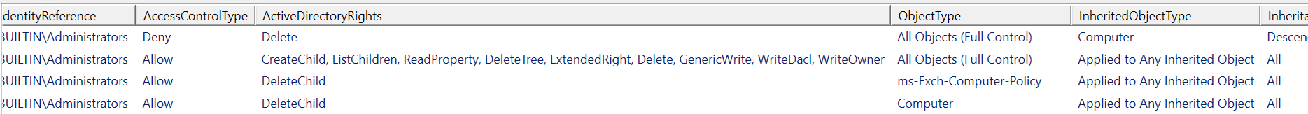 在UI告诉不同的情况下,Get-Acl显示的另一个例子是,当我通过Get-ACL在OU上获取域管理员的权限时,在解析了ObjectType和InheritedObjectType中的值(使用圣地亚哥·斯夸尔松提到的get -有效访问函数)之后,我得到了-