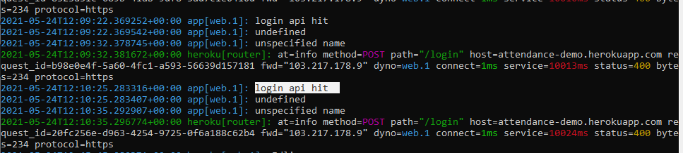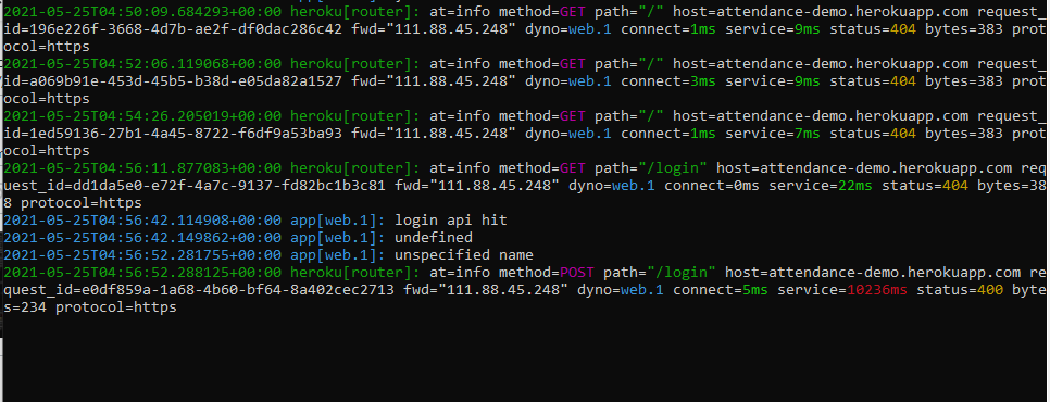 2021-05-25T11:16:07.240945+00:00 heroku[router]: at=info method=POST path="/login" host=attendance-demo.herokuapp.com request_id=ac9410a0-ac64-420b-b4d5-803aaa1a3fb2 fwd="111.88.134.32" dyno=web.1 connect=1ms service=10035ms status=400 bytes=234 protocol=https