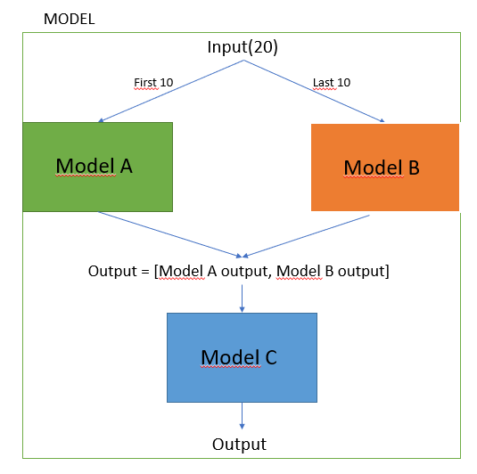 模型输入为20。模型A的输入为10 (初始输入的前10个元素),模型B的输入为10 (初始输入的最后10个元素),最后模型C的输入是A和B模型输出的连接。
