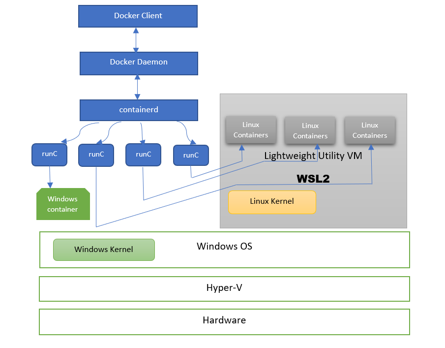 如果是这样的话,因为它使用linux操作系统作为它的基本映像,所以默认情况下它可以在linux上运行。但是由于存在WsL2,所以创建一个VM并在windows中模拟linux。这就是为什么我们可以在上运行windows映像和linux映像。