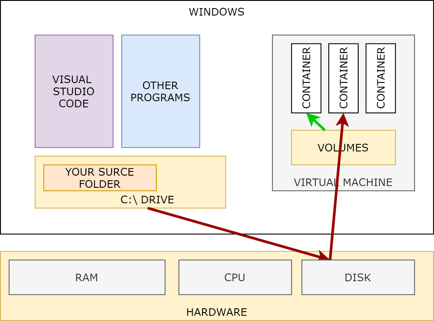 这张图不完全正确。Windows和承载WSL2 KVM的轻量级VM都位于超级V管理程序之上。换句话说,WSL2利用超级V。(另一种选择是只使用Hyper,但使用WSL2更无缝。)WSL2使用停靠桌面作为主要引导虚拟机,并使用停靠桌面数据存储图像和容器数据。9p网络协议用于无缝地访问主机到客户和客户对主机的文件: