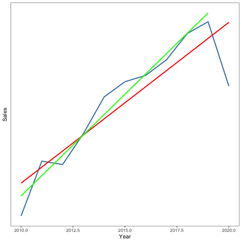 我正在对不同行业公司的净销售额数据进行研究。为此,我有一个包含不同行业公司净销售额的数据集。现在,我想在一张图上创建每个行业的地块,其中1条对应于每年净销售额的总和(从2010-2020年),另一条是2010-2019年到2020年的趋势线(因此,考虑到前几年,2020年的预期净销售额)。这样,我就有了一个直观的帮助,看看2020年的数字是否有明显的下降。我已经得到了使用dplyr