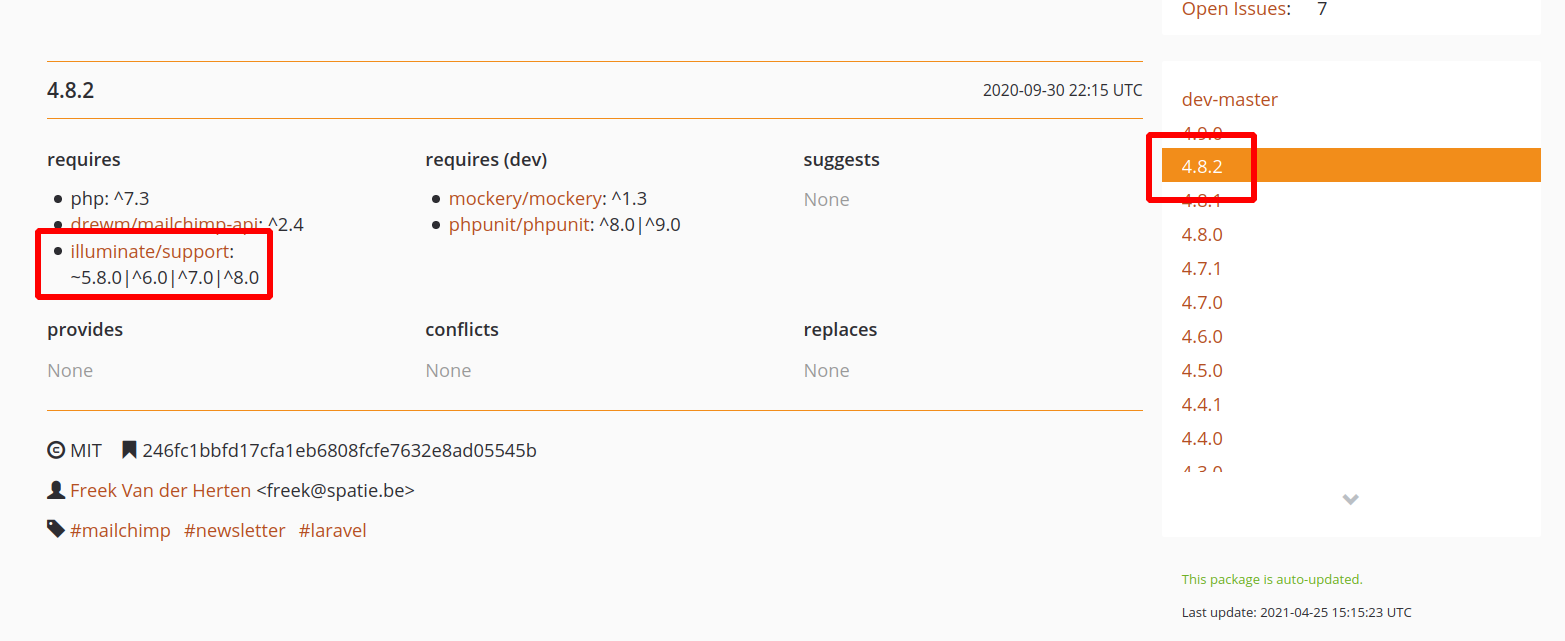 转到spatie/laravel-通讯的Packagist页面,找到支持Laravel5.8的软件包的版本。