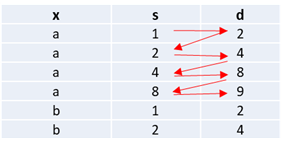 df = pd.DataFrame({"x":["a","a","a","a","b","b"], "s":[1,2,4,8,5,11],"d":[2,4,8,9,11,12]})