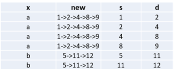 列s和d表示x列中对象的转换。我要做的是获取列x中每个对象的转换字符串。例如,对于新列,如下所示: