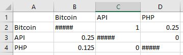 像一样,比特币在这一行中出现了8次,用 API 出现了2次,所以比特币与API之间的关系是:API总是与比特币一起存在,所以APIe 210