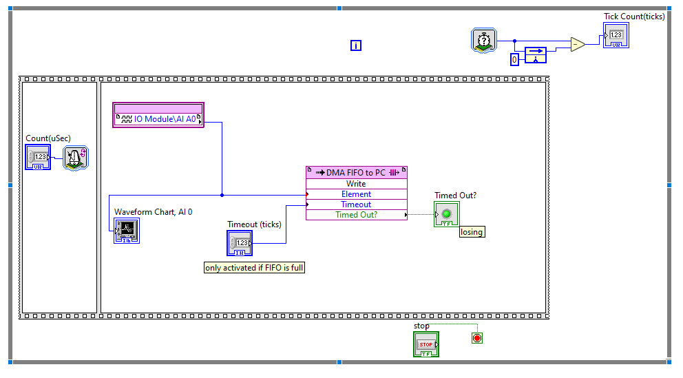 我看到滴答的速度没有变化,所以我认为,如果它加速的速度和我的正弦波一样快的话,它就会得到解决。另外,我通过FIFO和.txt文件传递数据,然后我绘制了这个文件,我也看不到正弦波,所以这不仅仅是图表显示的问题。