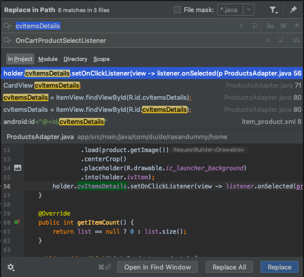 只需双击要更改的变量或函数,然后按CTRL + SHIFT + R。这种窗口将出现在Android上,它将告诉您所选部分在项目中的所有位置。你可以在你想要修改的地方修改代码,如果你不想改变它,跳过它,转到下一个代码,就让它保持不变。