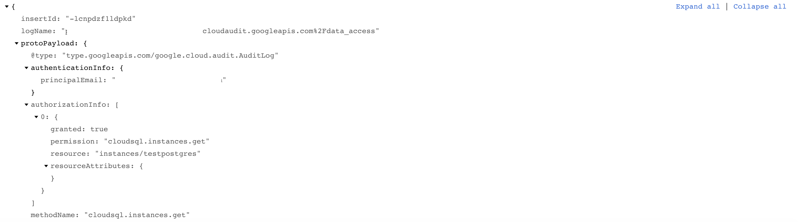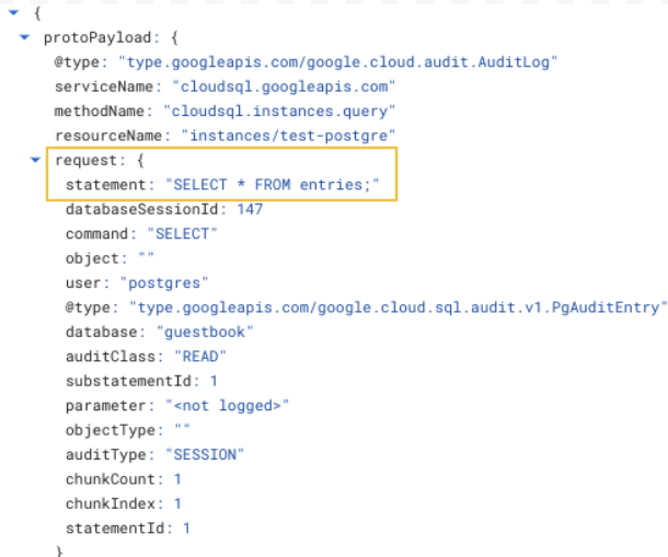 resource.type="cloudsql_database" logName="projects/<your-project-name>/logs/cloudaudit.googleapis.com%2Fdata_access" protoPayload.request.@type="type.googleapis.com/google.cloud.sql.audit.v1.PgAuditEntry"我使用PostgresSQL的快速启动进行测试。