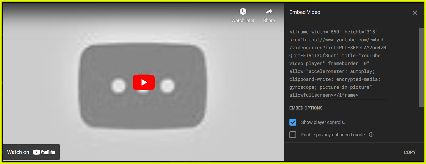 <iframe width="560" height="315" src="https://www.youtube.com/embed/videoseries?list=PLLE8FSeLAY2on4zMQrrmFEIVjTzQfS6qt" title="YouTube video player" frameborder="0" allow="accelerometer; autoplay; clipboard-write; encrypted-media; gyroscope; picture-in-picture" allowfullscreen></iframe>当我试图在YouTube上创建嵌入代码(图1,图2)时,似乎出现了一个问题,因为第一个视频的图片丢失了(图3),当我将鼠标悬停在“YouTube上的观察”上时,显示在浏览器左下角的链接是不正确的(图4)。