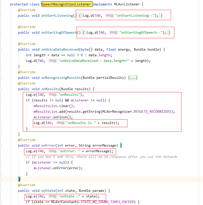 speechRecognizer?.setAsrListener(listener)fun startListening()speechRecognizer?.startRecognizing(speechIntent)fun destroy()speechRecognizer?.destroy()日志
