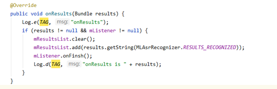MLAsrConstants.FEATURE参数设置为FUNCTION_ALLINONE。因此,您需要在onResults(Bundle results)方法中获得语音识别结果,如下图所示。