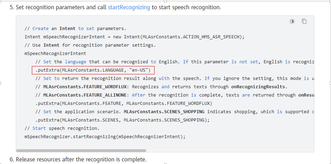 为了解决您的问题,我建议使用HMS ML工具包ASR切换到使用HMS ML工具包实时转录(RTT)。RTT提供了与ASR类似的语音识别功能,并将语音转换为文本。有关更多细节,请参见ML试剂盒-实时转录 (huawei.com)上的HMS文档。