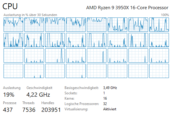 即使我减去仅是逻辑的核(因为它们不是“真实的”),也有一半的核心或多或少是不活动的。(16个真正的核心,但其中只有6-8个似乎真正起作用)