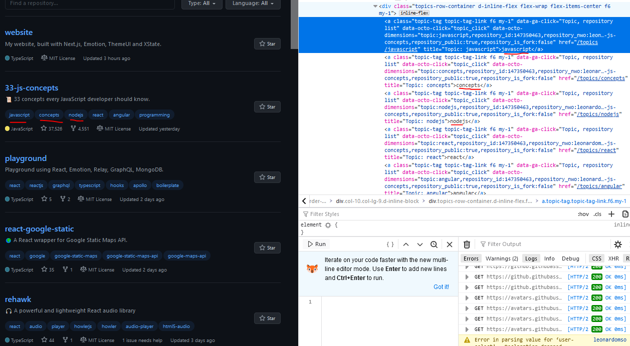 显示的代码是一个更大的循环的一部分,该循环遍历每个repo并擦拭其内容。我已经确认我能够捕获页面上每个回购项目的第一个元素(所以“33-js-概念”的javascript、“操场”的反应、“react google-静态”的反应等等)并能在第一次回购(所以javascript,概念,nodejs,react,角等)中的所有项目。但是在后续循环中继续得到这个错误。这是我的代码: