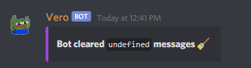 bulkDelete()返回已删除的消息,因此您应该使用该集合的size,因为它可能与用户输入不同。例如,如果通道中只有45条消息,并且您输入了!clear 100,那么机器人应该说它删除了46条消息(应该包括带有命令的消息),而不是100条。