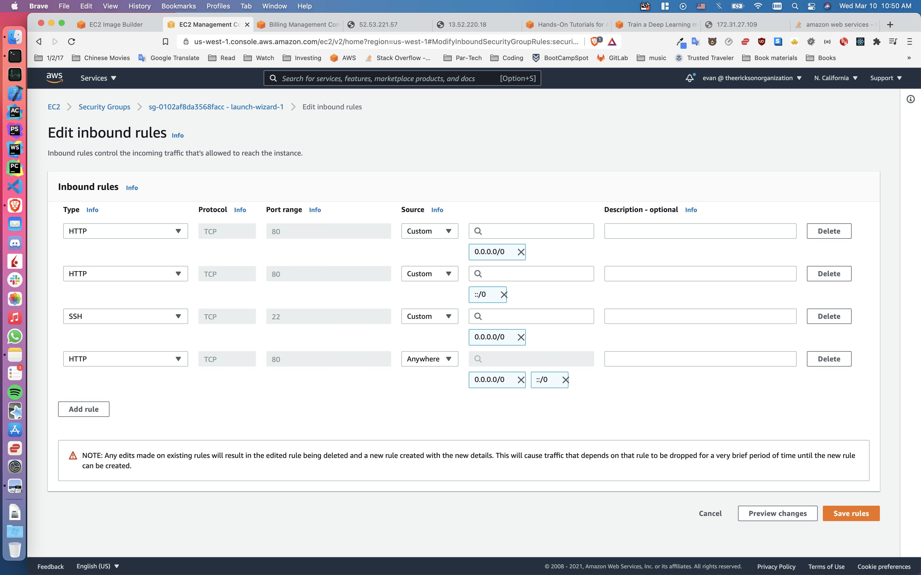 然后单击“编辑规则”。然后为HTTP添加一条新行,然后如果您看到source选项卡,单击它并将其切换到anywhere,然后它将自动填充0.0.0.0/0和::/0,这是我认为您需要的。