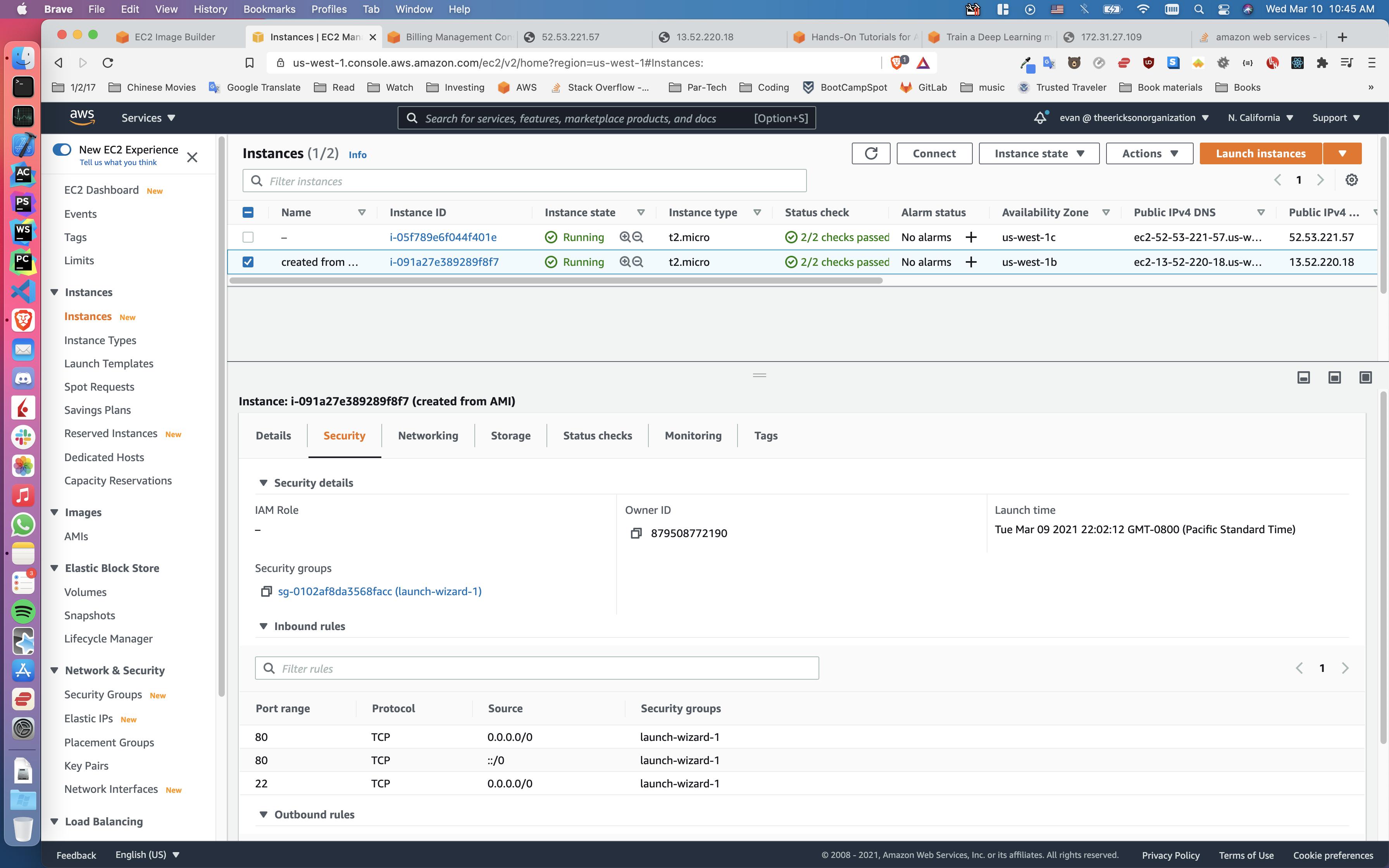 转到Ec2页面,单击实例以显示所有细节。单击“安全”选项卡,查看您的安全组是什么。我猜你的照片和我的不一样。您可能遗漏了完全打开80端口所需的底部的80 ::/0。