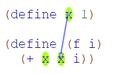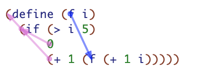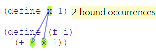 最后一行的形式相对于f而言处于尾部位置。然而,对f的递归调用不是:如果您在f上悬停,您将得到一个浅蓝色箭头,它告诉您函数绑定的是同一个f。下面是一张屏幕截图,展示了这两种情况: