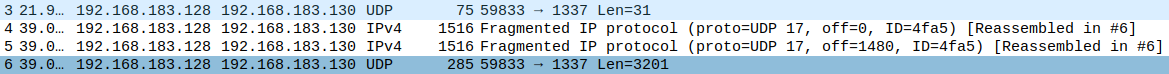 sniff(filter="ip dst host 192.168.183.130 and ((src port 1337) or (((ip[6:2] > 0) or (ip[7] > 0)) and (not ip[6] = 64))", iface="ens33", prn=print_package)这将检查数据包的碎片偏移量是否大于0(在第六个字节(标志)的前三位之后的任何内容或第七个字节之后的值都是>0),以及“不分段”位是否没有设置。如果这是真的,这是一个IP片段,嗅探器将嗅探它。
