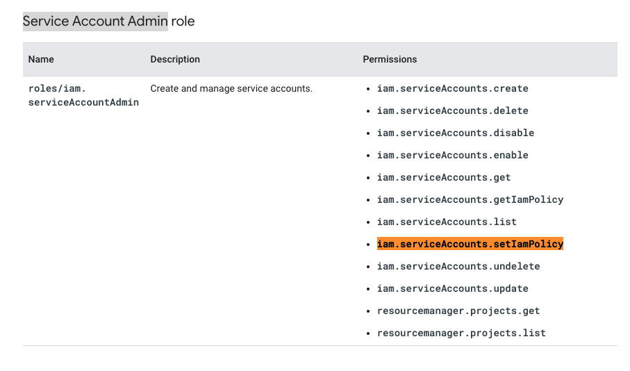 基于google 这里和错误消息,服务帐户管理应该足够了,我的服务帐户已经有了