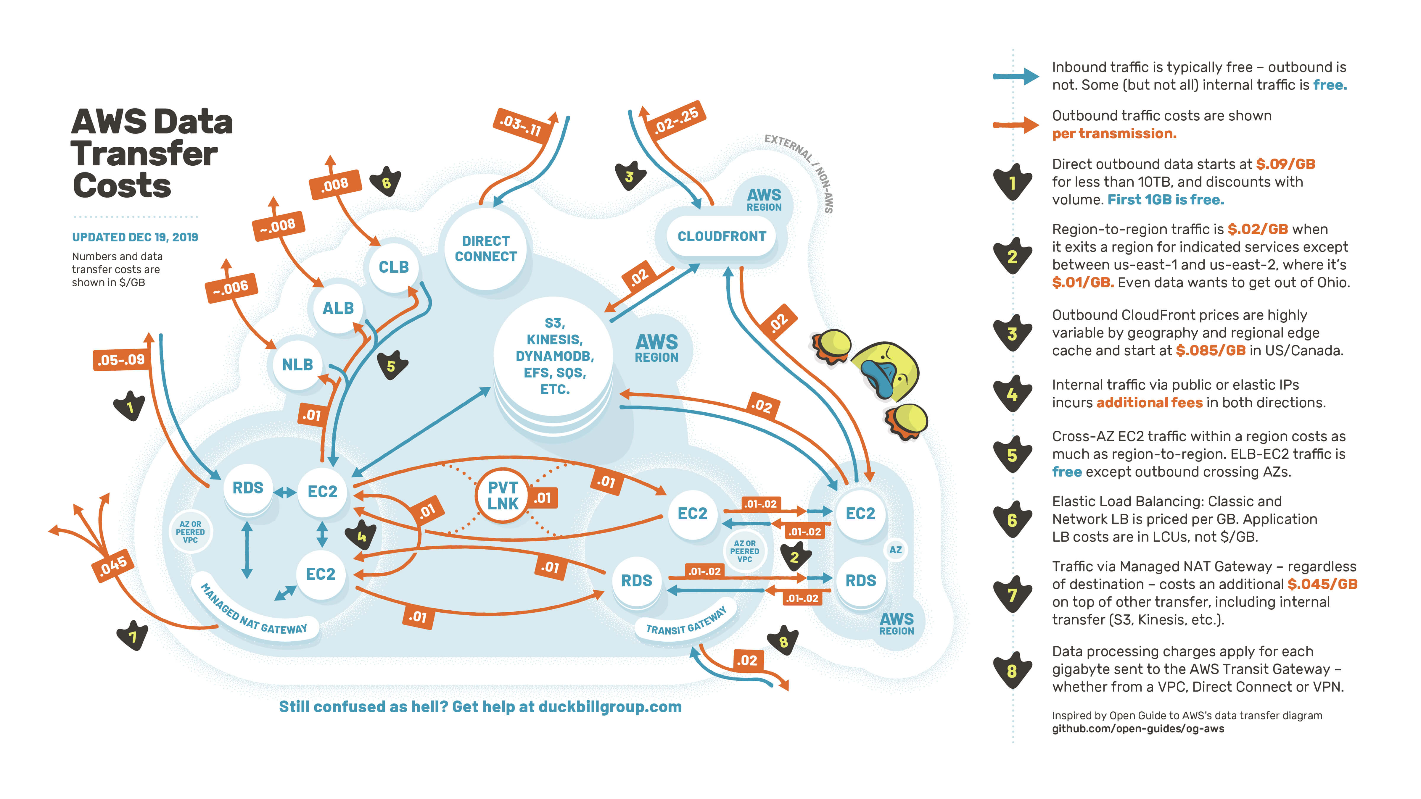 数据传输只对退出AWS和进入因特网的流量收取费用,尽管AZs和区域之间的流量也收取少量费用。