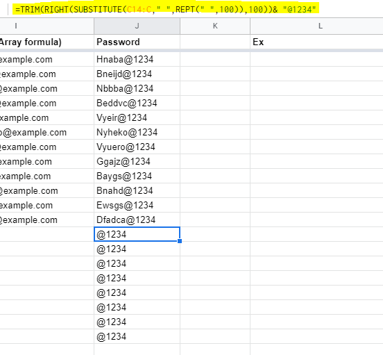 =IF(ISBLANK(C14), "", TRIM(RIGHT(SUBSTITUTE(C14:C," ",REPT(" ",100)),100))& "@1234")您应该使用IF函数来检查相应的单元格ISBLANK是否。