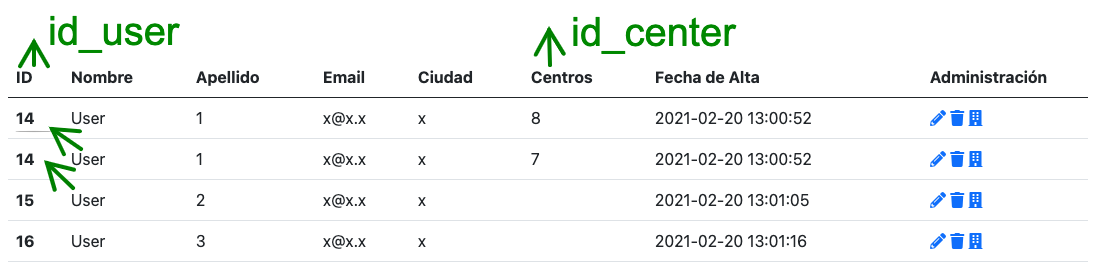 在第三个表中,我将用户与中心连接起来,因为一个用户可以处理不同的中心。