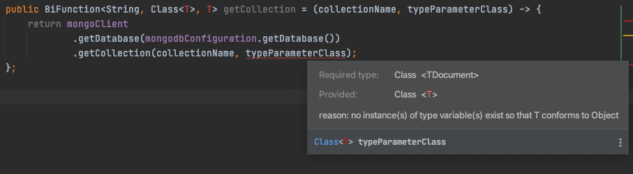 public BiFunction<String, Class<T>, T> getCollection = (collectionName, typeParameterClass) -> {